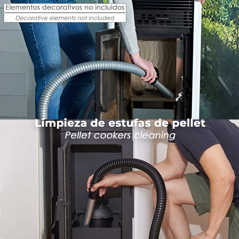 El aspirador de cenizas Wolfpack incluye un tubo de 1 metro de longitud y 35 mm de diámetro, que ofrece un alcance adecuado para llegar al interior de estufas, chimeneas y otros equipos de combustión. Esta medida proporciona un equilibrio perfecto entre maniobrabilidad y eficacia durante el uso.