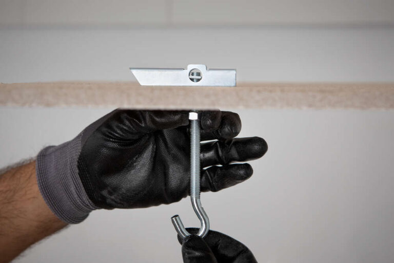 Taco de vuelco con gancho, tuerca y arandela. Se puede emplear para instalar con facilidad elementos ligeros en falsos techos de yeso laminado, escayola u otros materiales huecos. Permite instalar en suspensión lámparas, plafones o ventiladores de techo. Está fabricado en acero con recubrimiento zincado.