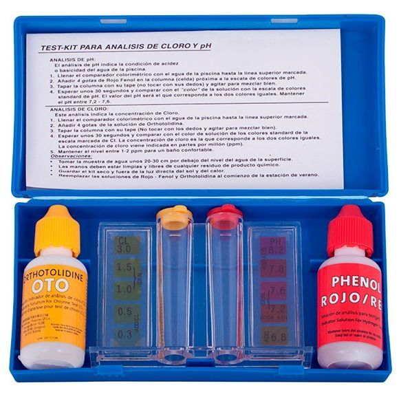 Kit para análisis del cloro y ph del agua de la piscina. Tomar la muestra de agua unos 20-30cm por debajo del nivel del agua de la superficie.. Las manos deben estar limpias y libres de cualquier residuo de producto quimico. Guardar el kit seco y fuera de la luz directa del sol y del calor.